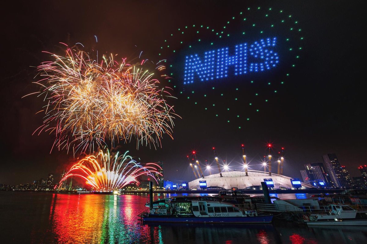 Light projections lit up the sky over the o2 arena, including the nhs logo in a heart accompanied by a child's voice saying:
